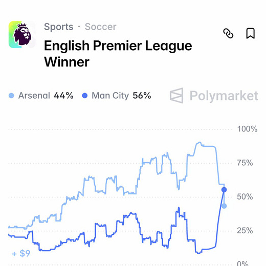 Polymarket Sports posted odds showing Arsenal’s title chances sliding while Man City surge back into favour. Odds are not destiny, but they are a tidy mirror for how quickly narratives change when results stack up.