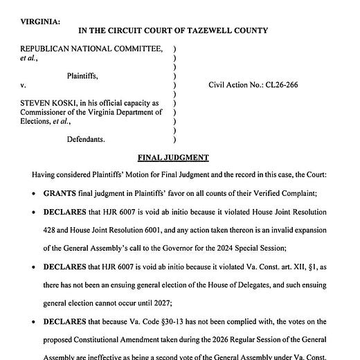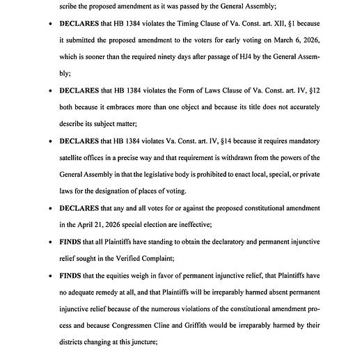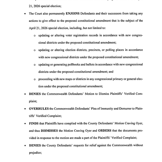 MeidasTouch reports a Virginia judge struck down a Democratic-backed redistricting amendment, calling it unconstitutional and void from the start, and invalidating votes from a special election held under the new maps. Whatever your politics, this is the kind of procedural landmine that turns election administration into a long, grinding legal fight.